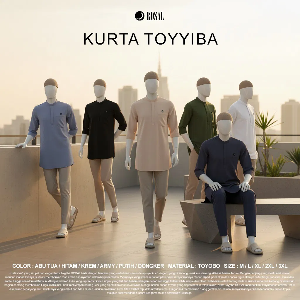 Kurta Toyyiba ROSAL hadir dengan tampilan yang sederhana namun tetap syar’i dan elegan, yang dirancang untuk mendukung aktivitas harian Antum. Dengan panjang yang ideal untuk shalat maupun ibadah lainnya, kurta ini memberikan rasa aman dan nyaman dalam berpenampilan. Warnanya yang kalem serta tampilan polos menjadikannya mudah dipadupadankan dan cocok digunakan pada berbagai suasana, mulai dari santai hingga semi-formal.